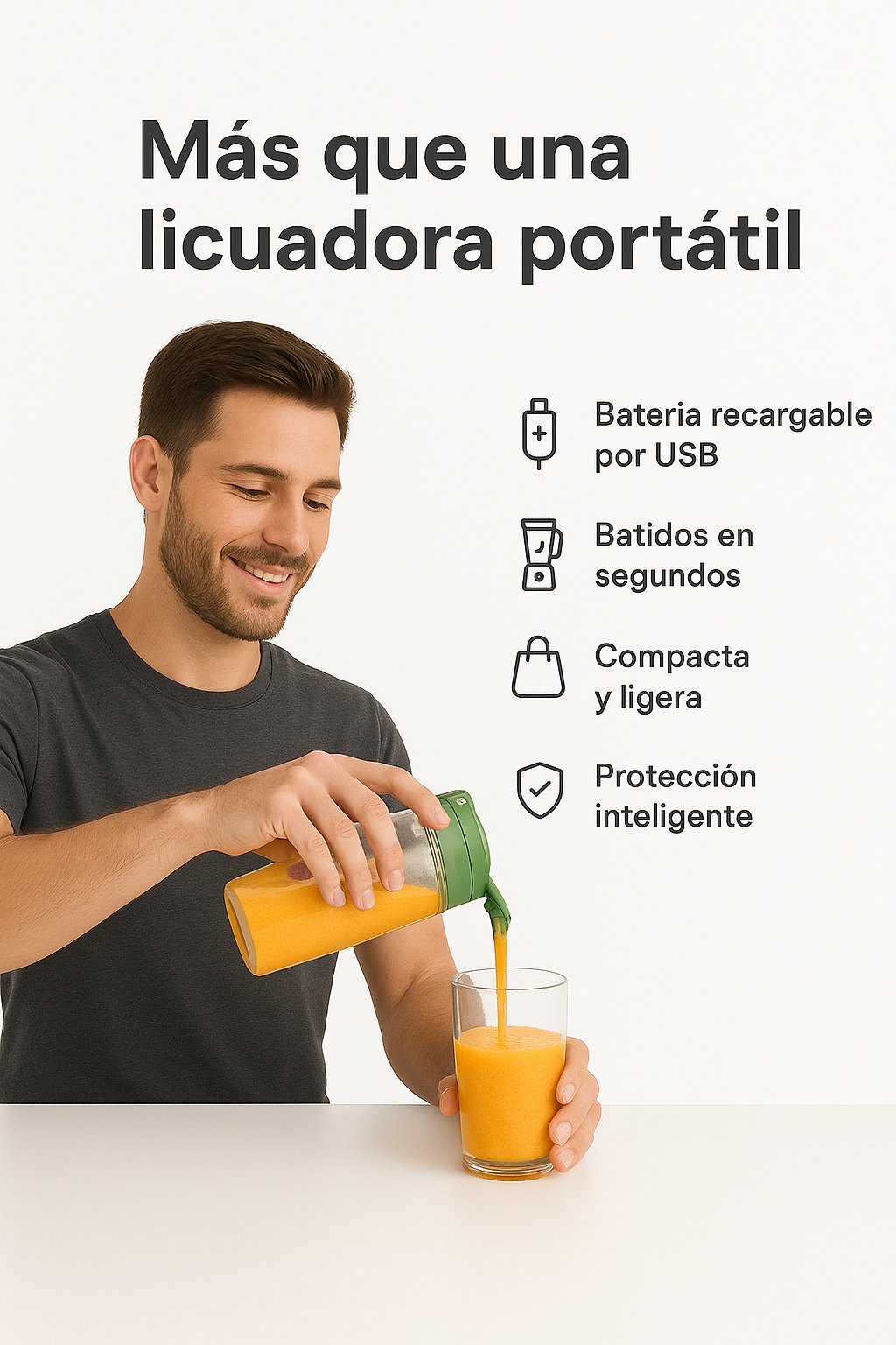 Olvídate de las prisas y la comida rápida. Con la Mini Licuadora Portátil podrás preparar batidos, smoothies y jugos naturales en menos de 30 segundos. Compacta, recargable por USB y fácil de llevar al gym, la oficina o tus viajes.